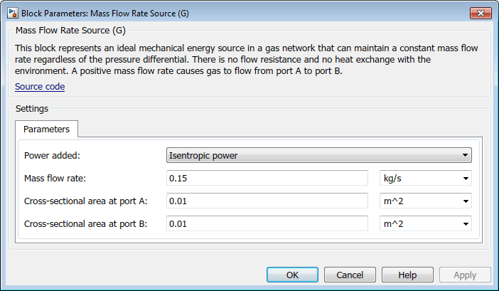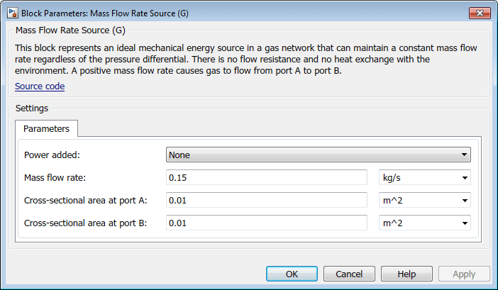 Причиной повышения температуры является то, что источник должен выполнять работу, поднимать давление и приводить в движение желаемый расход через систему, которая добавляет энергию газу. Таким образом, источник может рассматриваться как идеализированный компрессор или насос. Однако наше намерение состоит только в том, чтобы указать граничное состояние выше по потоку 400 К и 0,15 кг/с, независимо от того, имеется ли компрессор выше по потоку или нет. Поэтому в диалоговом окне Источник массового расхода (G) переключите добавленный параметр мощности на None.