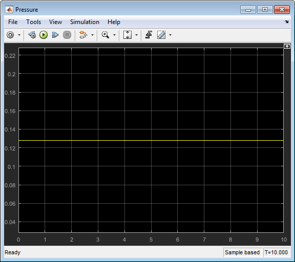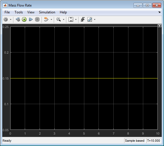 Моделирование модели. Для подачи 0,15 кг/с газа через ограничение блок источника массового расхода (G) увеличил давление от атмосферного (как указано блоком резервуара выше по потоку) почти до 0,13 МПа.