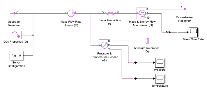 Для измерения абсолютного давления и температуры перед локальным ограничением добавьте блок датчика давления и температуры (G) и подключите блок абсолютного эталона (G) к узлу B датчика. Продублируйте пару блок «converter-scope», чтобы добавить в модель области «Pressure» и «Temperature», как показано на диаграмме.