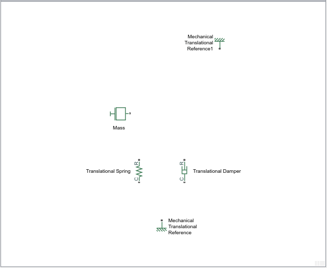 Перетащите в окно модели блоки «Масса», «Поступательная пружина», «Поступательный демпфер» и «Механическая поступательная привязка».