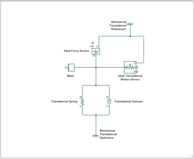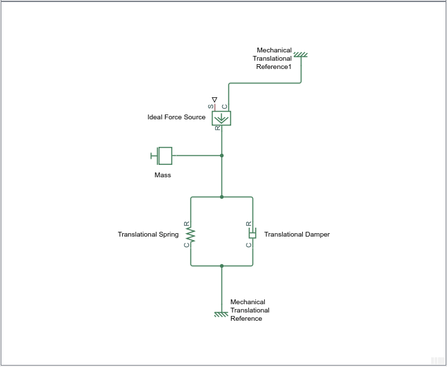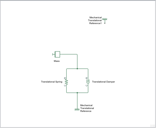 Соедините блоки поступательной пружины, поступательного демпфера и массы с одним из блоков механической поступательной привязки, как показано на следующей иллюстрации.