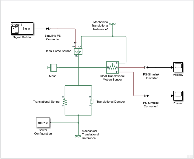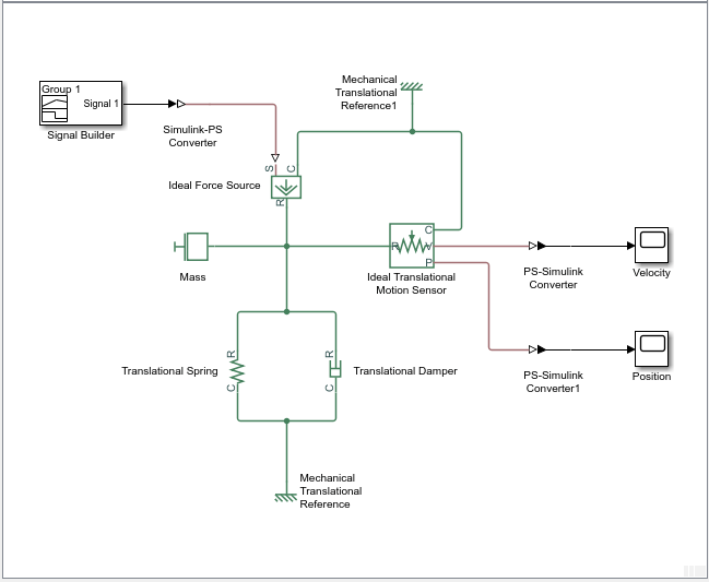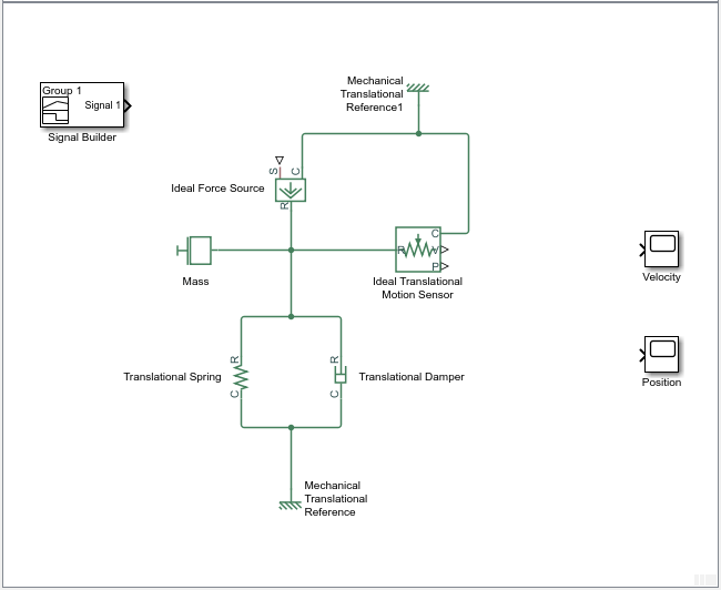Следующая схема представляет простую модель подвески автомобиля. Он состоит из пружины и демпфера, соединенных с корпусом (представленным как масса), который перемешивается силой. Можно изменять параметры модели, такие как жесткость пружины, масса тела или профиль силы, и просматривать результирующие изменения скорости и положения тела.