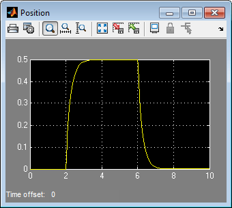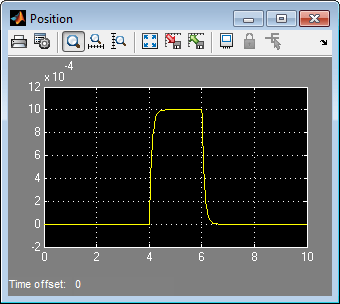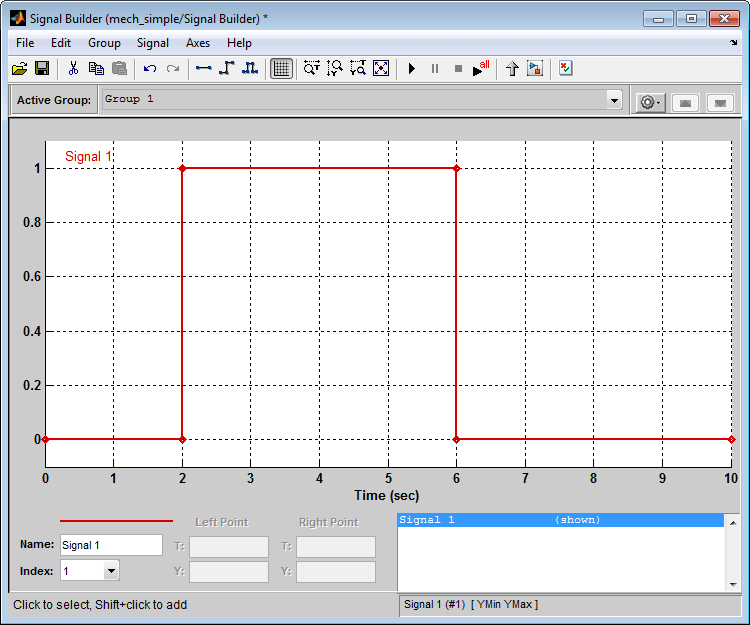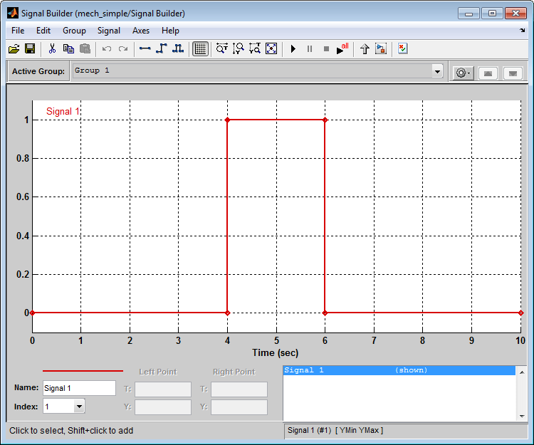 Входной сигнал для силы подается блоком Signal Builder. Профиль сигнала показан на иллюстрации ниже. Он начинается со значения 0, затем через 4 секунды шаг изменяется на 1, а затем возвращается на 0 через 6 секунд. Это профиль по умолчанию.
