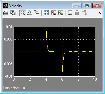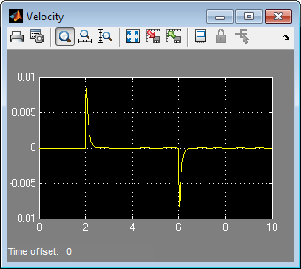 В начале масса находится в состоянии покоя. Затем через 4 секунды, когда входной сигнал резко изменяется, скорость массы увеличивается в положительном направлении и постепенно возвращается к нулю. Положение массы в то же время изменяется более постепенно из-за инерции и демпфирования и остается на новом значении до тех пор, пока на него действует сила. Через 6 секунд, когда входной сигнал изменяется обратно на ноль, скорость получает зеркальный всплеск, и масса постепенно возвращается в исходное положение.