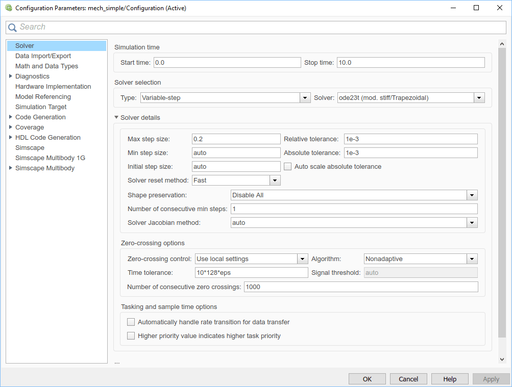 После составления блок-схемы модели, как описано в предыдущем разделе, необходимо выбрать решатель и указать правильные значения параметров конфигурации.