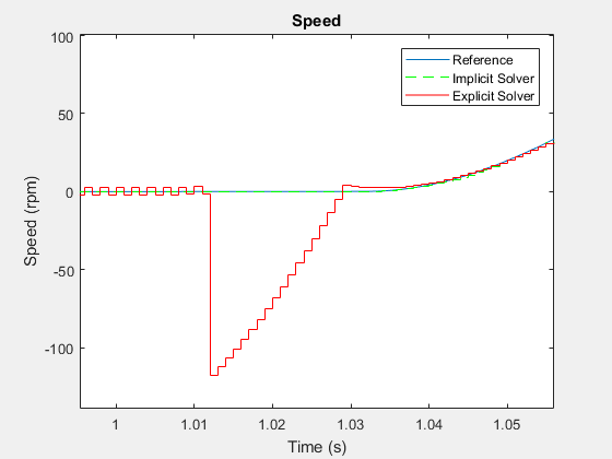 Неявный решатель следует по пути, аналогичному пути, который используется решателем с переменным шагом при создании результатов привязки. Колебания, которые проявляет явный решатель, указывают на то, что модель является численно жесткой. Колебания также указывают на то, что явный решатель является более затратным с точки зрения вычислений, чем неявный решатель для моделирования жесткой модели. Используйте глобальный или локальный неявный решатель с фиксированным шагом для моделирования в реальном времени с численно жесткими моделями, чтобы избежать ненужных вычислительных затрат.