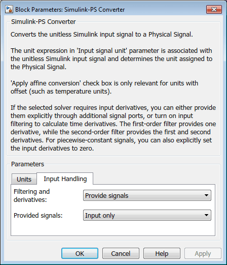 При добавлении в модель нового блока Simulink-PS Converter опции обработки ввода по умолчанию: Provide signals и Input onlyи блок имеет один входной порт Simulink ® и один выходной порт физического сигнала.