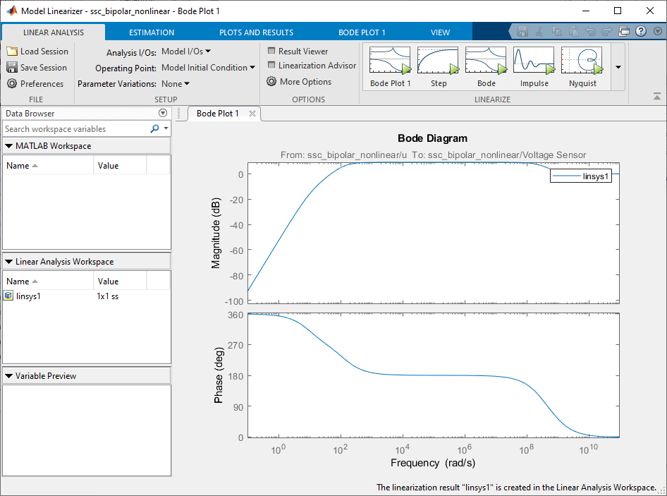 Модель настроена для линеаризации. Вы можете быстро генерировать и просматривать частотную характеристику малого сигнала, нажав кнопку Linearize circuit гиперссылка в аннотации модели. Чтобы просмотреть сценарий MATLAB, генерирующий частотный отклик, щелкните следующую гиперссылку в этой аннотации, see code. Эта документация содержит справочную информацию и альтернативные способы линеаризации, основанные на имеющемся программном обеспечении.
