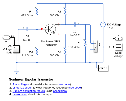 В этом примере показано, как линеаризовать модель нелинейной схемы биполярного транзистора и создать график Боде для анализа частотной области малого сигнала.