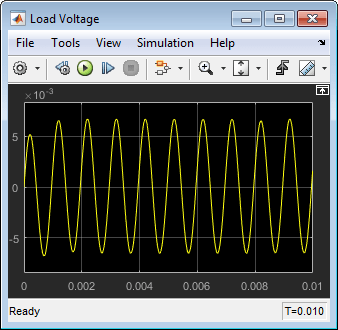 Откройте блок Конфигурация решателя (Solver Configuration) и убедитесь, что установлен флажок Начать моделирование из устойчивого состояния (Start simulation from steading state). Затем откройте область «Напряжение нагрузки» и запустите моделирование, чтобы увидеть основные характеристики цепи. Начальные напряжения емкости транзисторного перехода устанавливаются соответствующими условиям смещения, определяемым резисторами. Выходной сигнал представляет собой устойчивую синусоиду с нулевой средней амплитудой, усиленную транзистором и схемой смещения.