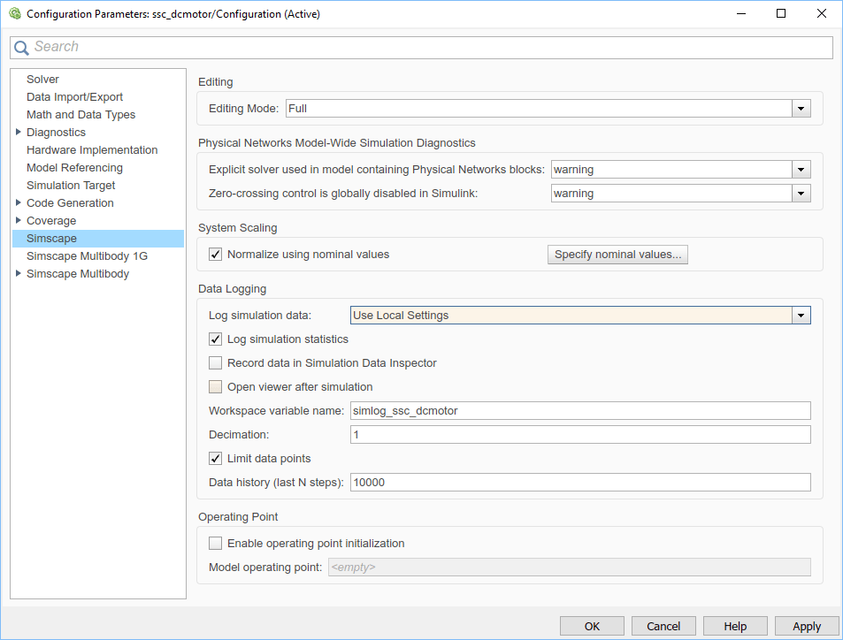 Откройте диалоговое окно «Параметры конфигурации» и на левой панели выберите «Simscape». В этом примере модели включено ведение журнала данных для всей модели. Чтобы включить протоколирование данных по блокам, установите для параметра Log simulation data значение Use local settings и нажмите кнопку ОК.