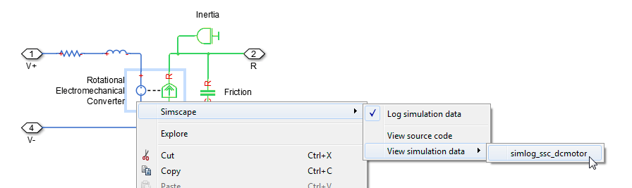 Выберите блоки для регистрации данных. Щелкните правой кнопкой мыши блок вращательного электромеханического преобразователя. В контекстном меню выберите Simscape > Log simulation data.