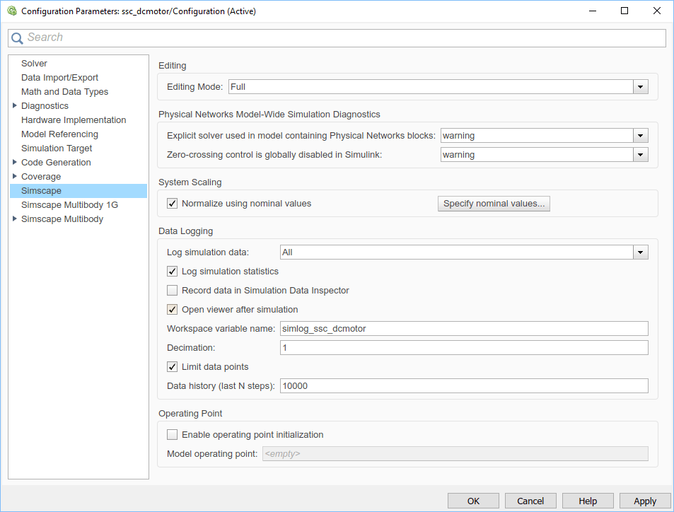 Откройте диалоговое окно «Параметры конфигурации» и на левой панели выберите «Simscape». Можно видеть, что в этой модели уже включен журнал данных для всей модели, а также статистика моделирования, и что имя переменной рабочей области имеет значение simlog_ssc_dcmotor. Установите флажок Открыть средство просмотра после моделирования (Open Viewer after simulation) и нажмите кнопку ОК.