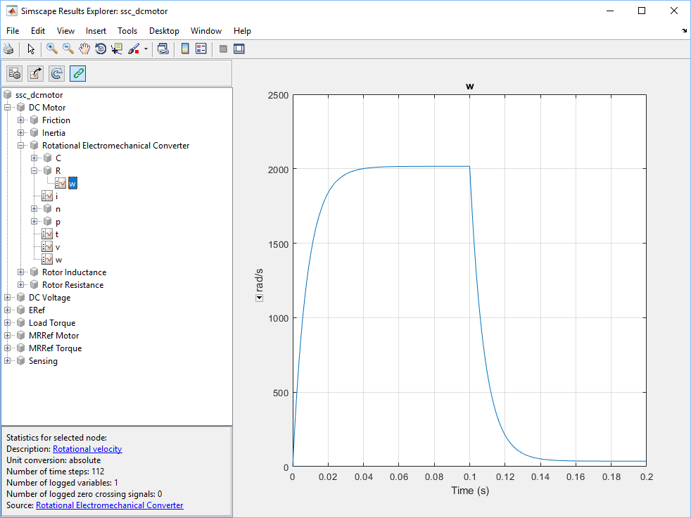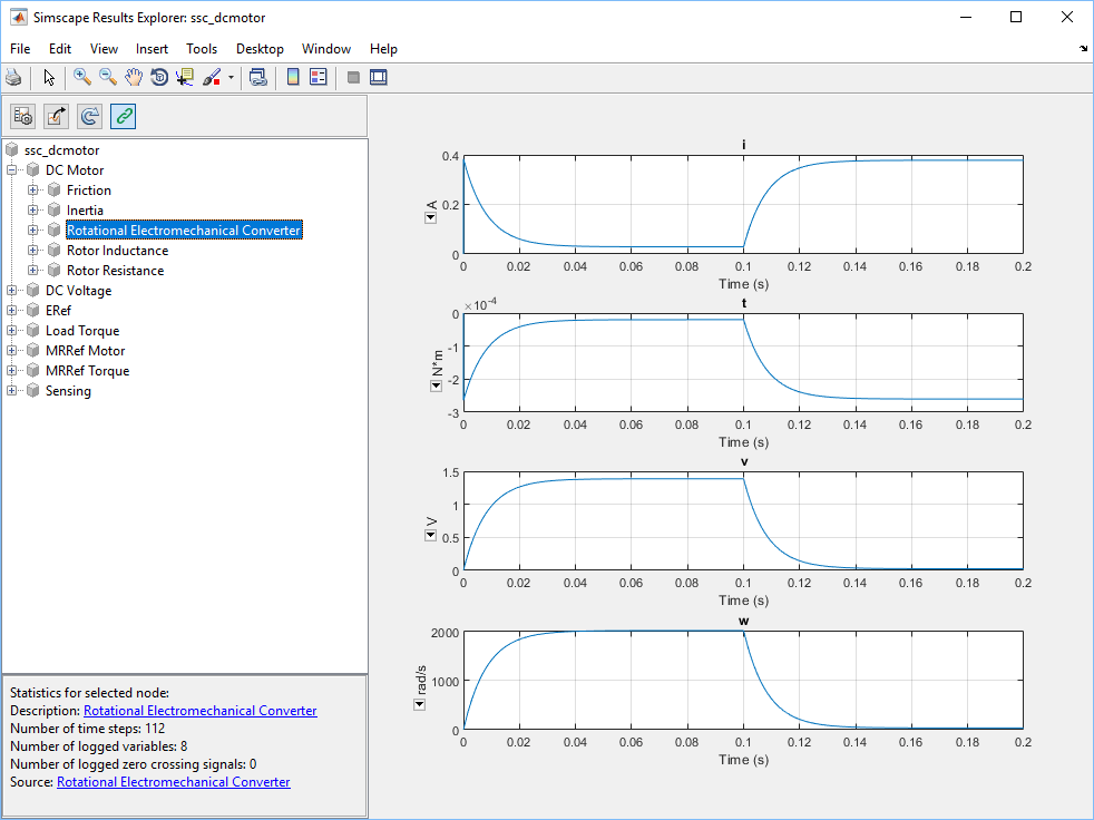 Если щелкнуть узел на левой панели, соответствующие графики появятся на правой панели. Разверните окно DC_Motor и нажмите кнопку Rotational_Electromechanical_Converter для просмотра всех узловых графиков для этого блока.