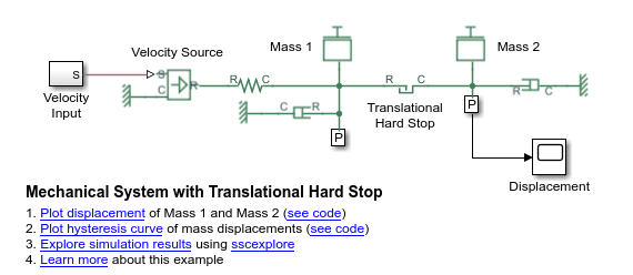Откройте пример модели Mechanical System with Translational Hard Stop, введя ssc_mechanical_system_translational_hardstop в окне команд MATLAB ® .
