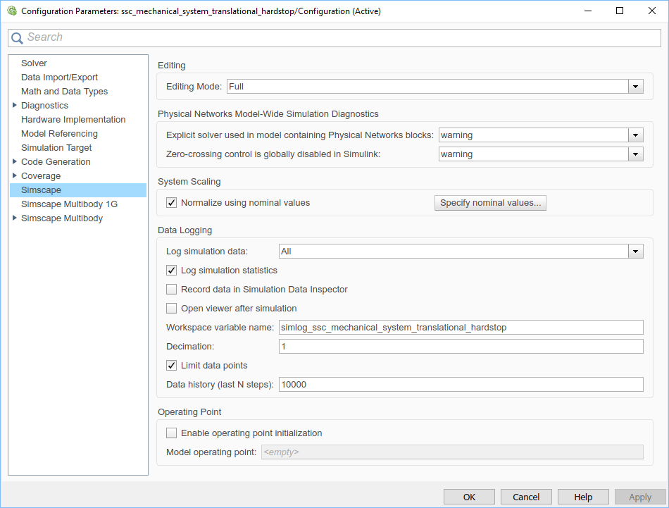 Откройте диалоговое окно «Параметры конфигурации» и на левой панели выберите «Simscape». Можно видеть, что в этой модели уже включен журнал данных для всей модели, а также статистика моделирования, и что имя переменной рабочей области имеет значение simlog_ssc_mechanical_system_translational_hardstop.