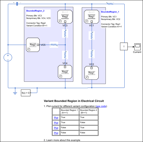 Чтобы открыть пример модели Вариация ограниченной области в электрической цепи (Variant Bounded Region in Electrical Circuit), введите ssc_variant_connector_bounded_region в окне команд MATLAB ®.