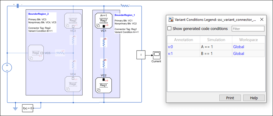 Эта модель имеет две ограниченные области: BoundedRegion_1 и BoundedRegion_2. В BoundedRegion_1 параметры тега коннектора блоков коннектора исполнения имеют значение Reg1и, в BoundedRegion_2, для параметров тега Connector установлено значение Reg2. BoundedRegion_1 имеет один основной блок «Соединитель исполнения» (VC_1) и связанный с ним блок «Соединитель исполнения» (VC_2). Условие варианта BoundedRegion_1: A == 1. У BoundedRegion_2 есть один основной Различный блок Соединителя, VC_3, и два связанных неосновных Различных блока Соединителя, VC_4 и VC_5. Условие варианта BoundedRegion_2: B == 1.