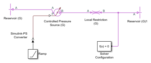 Следующая модель иллюстрирует подавленный поток. В этой модели блок пандуса имеет наклон 0,005 и время начала 10. Блок преобразователя Simulink-PS имеет блок входного сигнала, установленный в Mpa. Все остальные блоки имеют значения параметров по умолчанию. Время моделирования составляет 50 с. При моделировании модели давление в порту A блока локального ограничения (G) линейно увеличивается от атмосферного давления, начиная с 10. Давление в порту B фиксируется при атмосферном давлении.