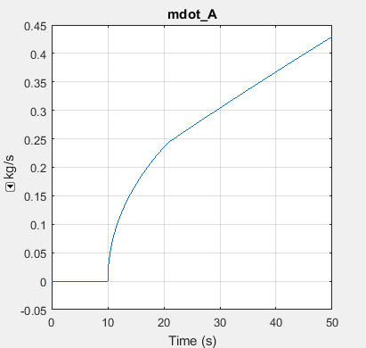 На следующем рисунке показаны записанные данные моделирования для блока локального ограничения (G). Число Маха при ограничении (Mach_R) достигает 1 через 20 с, что указывает на подавление потока. Массовый расход (mdot_A) перед подавлением потока следует типичному квадратичному поведению по отношению к возрастающей разности давлений. Однако массовый расход после дросселирования потока становится линейным, потому что массовый расход дросселирования зависит только от давления и температуры выше по потоку, и давление выше по потоку линейно увеличивается.
