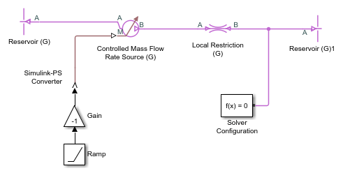 Тот факт, что массовый расход дросселирования зависит только от условий выше по потоку, может вызвать несовместимость с источником массового расхода (G) или источником контролируемого массового расхода (G), подключенным ниже по потоку от дросселирующего блока. Рассмотрим модель, показанную на следующей иллюстрации, которая содержит блок источника контролируемого массового расхода (G) вместо источника контролируемого давления (G).