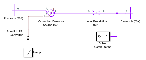 Следующая модель иллюстрирует подавленный поток. В этой модели блок пандуса имеет наклон 0,005 и время начала 10. Блок преобразователя Simulink-PS имеет блок входного сигнала, установленный в MPa. Все остальные блоки имеют значения параметров по умолчанию. Время моделирования составляет 50 с. При моделировании модели давление в порту A блока локального ограничения (MA) линейно увеличивается от атмосферного давления, начиная с 10. Давление в порту B фиксируется при атмосферном давлении.