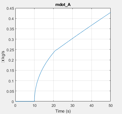 На следующих двух графиках показаны записанные данные моделирования для блока локального ограничения (MA). Число Маха при ограничении (Маха) достигает 1 примерно через 20 с, что указывает на подавление потока. Массовый расход (mdot_A) перед подавлением потока следует типичному квадратичному поведению по отношению к возрастающей разности давлений. Однако массовый расход после дросселирования потока становится линейным, потому что массовый расход дросселирования зависит только от давления и температуры выше по потоку, и давление выше по потоку линейно увеличивается.