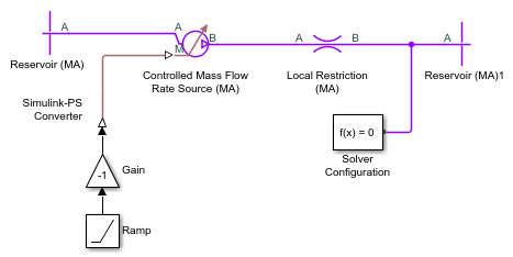 Тот факт, что массовый расход дросселирования зависит только от условий выше по потоку, может вызвать несовместимость с источником массового расхода (МА) или блоком источника контролируемого массового расхода (МА), подключенным ниже по потоку от дроссельного блока. Рассмотрим эту модель, которая содержит блок источника управляемого массового расхода (MA) вместо блока источника управляемого давления (MA).