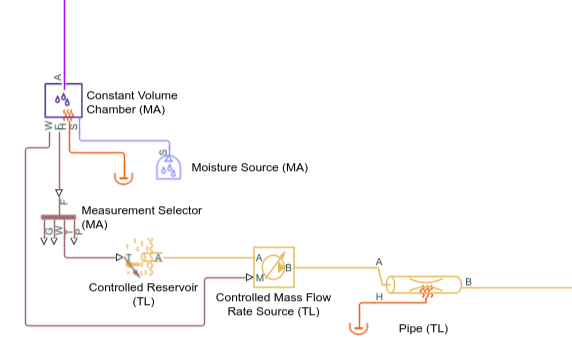 Состояние текучей среды объема влажного воздуха в этих блоках сообщается портом выхода физического сигнала F. Соедините порт F с блоком селектора измерений (МА) для извлечения измерений давления, температуры, уровня влаги и уровня следового газа во время моделирования.