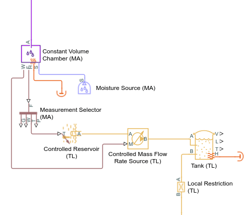 Считается, что влага, которая конденсируется, покидает сеть влажного воздуха, поэтому масса и энергия конденсированной жидкой воды вычитается из объема влажного воздуха. Скорость конденсации сообщается портом выхода физического сигнала W. Если вы хотите смоделировать поток конденсированной жидкой воды, вы можете использовать скорость конденсации в качестве входа для другой сети текучей среды (гидравлической, термической жидкости, двухфазной жидкости или другой сети влажного воздуха). В следующем примере показано, как использовать тепловую жидкую сеть для моделирования конденсата, который стекает из камеры постоянного объема (MA) через трубу.