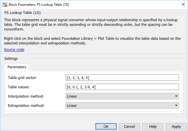 Создайте новую модель и добавьте блок «Таблица поиска PS» (1D). Задайте параметры блока, как показано на рисунке.