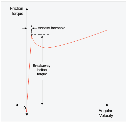 Крутящий момент отрыва моделируется как функция порога скорости. Когда скорость близка к нулю, небольшое изменение скорости приводит к большому изменению крутящего момента. Когда скорость не близка к нулю, изменение крутящего момента происходит более постепенно. Этот блок представляет собой жесткий элемент. Чтобы сделать элемент менее жестким, задайте более высокое значение скорости трения отрыва.