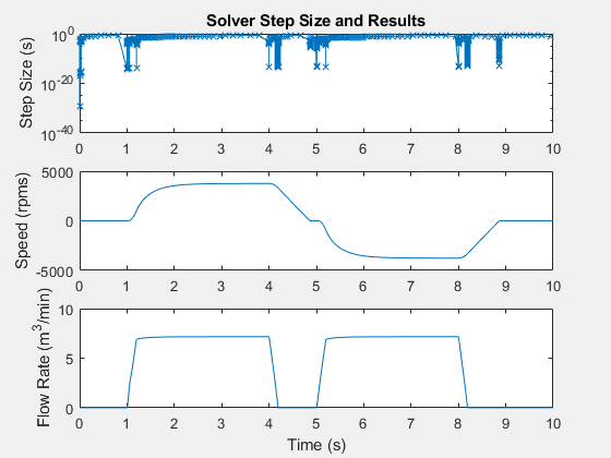 h1 = figure; subplot(3,1,1) semilogy(tout(1:end-1),diff(tout),'-x') title('Solver Step Size and Results') ylabel('Step Size (s)') subplot(3,1,2) plot(tout,Pneu_rts_RPM_DATA.signals.values) ylabel('Speed (rpms)') subplot(3,1,3) plot(tout,Pneu_rts_Vol_Flow_DATA.signals.values) xlabel('Time (s)') ylabel('Flow Rate (m^3/min)')