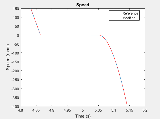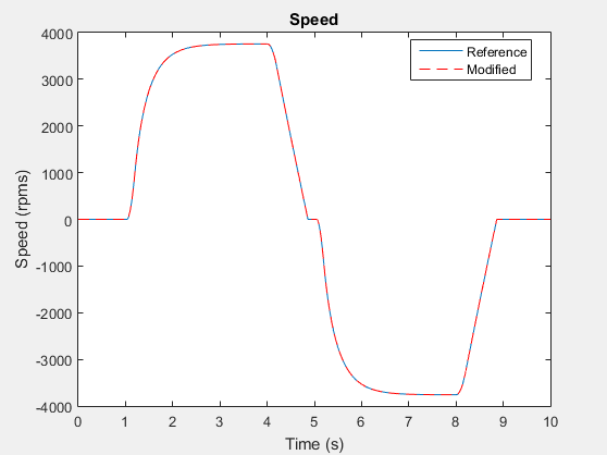 h3 = figure; plot(timeRef,speedRef) h3; hold on plot(timeMod,speedMod,'r--') title('Speed') xlabel('Time (s)') ylabel('Speed (rpms)') h3Leg = legend({'Reference','Modified'},'Location','best');