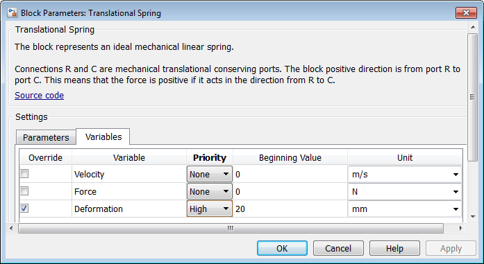При открытии вкладки «Переменные» диалогового окна блока в нем перечисляются все открытые переменные, указанные в базовом файле компонента, а также приоритет, начальное (целевое) значение и единица измерения. Например, если добавить в модель блок поступательной пружины, дважды щелкните его, чтобы открыть диалоговое окно, а затем перейдите на вкладку Переменные (Variables), он выглядит следующим образом: