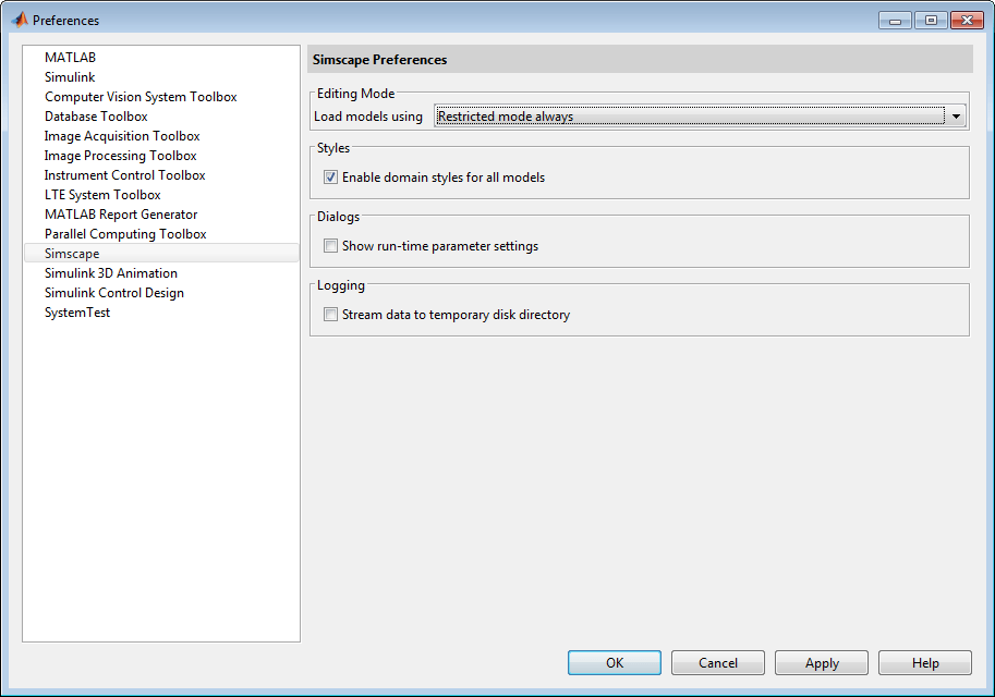 На левой панели диалогового окна «Установки» выберите «Simscape». На правой панели отображается рамка группы Режим редактирования (Editing Mode). По умолчанию для опции Загрузить модели с помощью (Load models using) задано значение Editing mode specified in models.