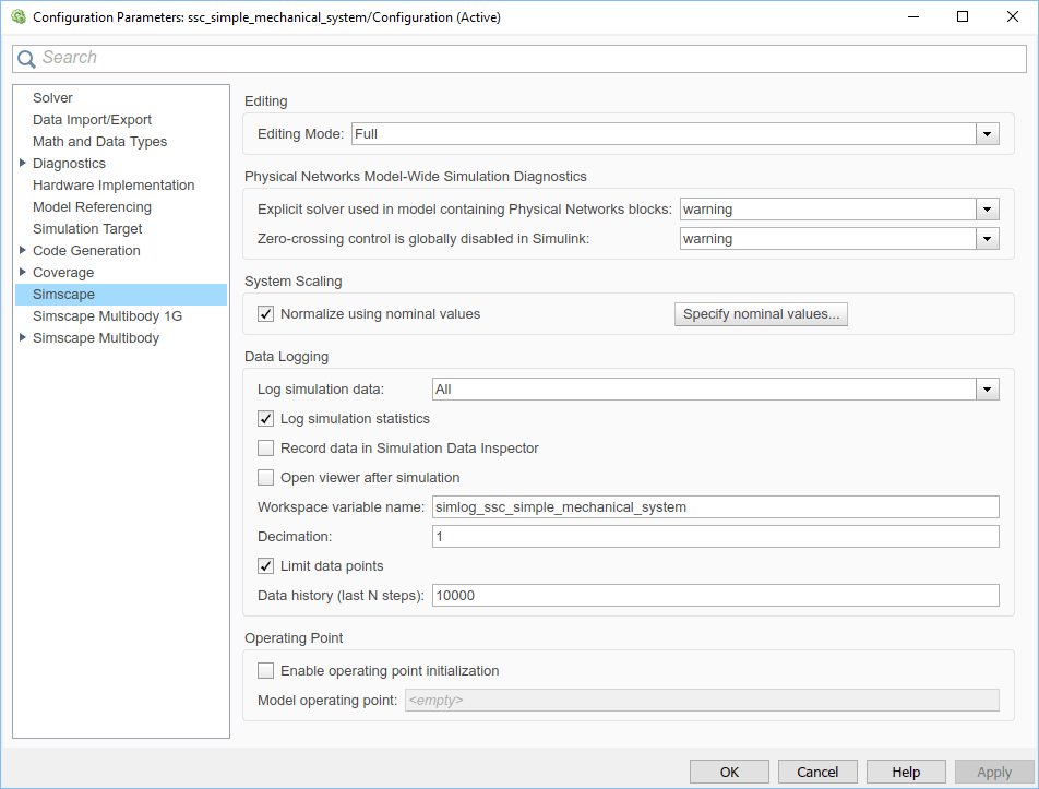 На левой панели диалогового окна «Параметры конфигурации» выберите «Simscape». На правой панели отображается параметр «Режим редактирования».
