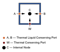 Второй набор узлов представляет интерфейсы, через которые конечный том может взаимодействовать со своими соседями. Эти узлы видны как консервационные порты Simscape, из которых наиболее важными являются консервационные порты Thermal Liquid. Допуская обмен массой, импульсом и энергией между соседними объемами жидкости, порты сохранения тепловой жидкости управляют динамической эволюцией конечного объема, когда он стремится к установившемуся состоянию.