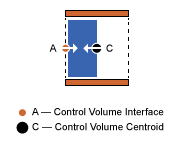Вычисления расхода выполняются для половины контрольного объема термического жидкого компонента. Половина управляющего объема ограничена на одном конце интерфейсом, который представляет порт, а на другом конце параллельной поверхностью, проходящей через центроид управляющего объема.