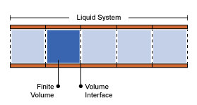 Модели Thermal Liquid основаны на методе конечных объемов. Этот способ дискретизирует тепловую жидкую систему в несколько контрольных объемов, которые взаимодействуют через общие интерфейсы. Система нефтепровода является одним из примеров: можно смоделировать эту систему как набор сегментов трубопровода, которые соединяются последовательно по длине трубопровода.