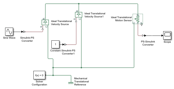 При попытке моделирования модели решатель выдает сообщение об ошибке со ссылками на блоки Ideal Translational Velocity Source и Ideal Translational Velocity Source1. Чтобы зафиксировать цепь, можно либо заменить два источника скорости одним блоком Ideal Translational Velocity Source, либо добавить между ними блок Translational Damper.