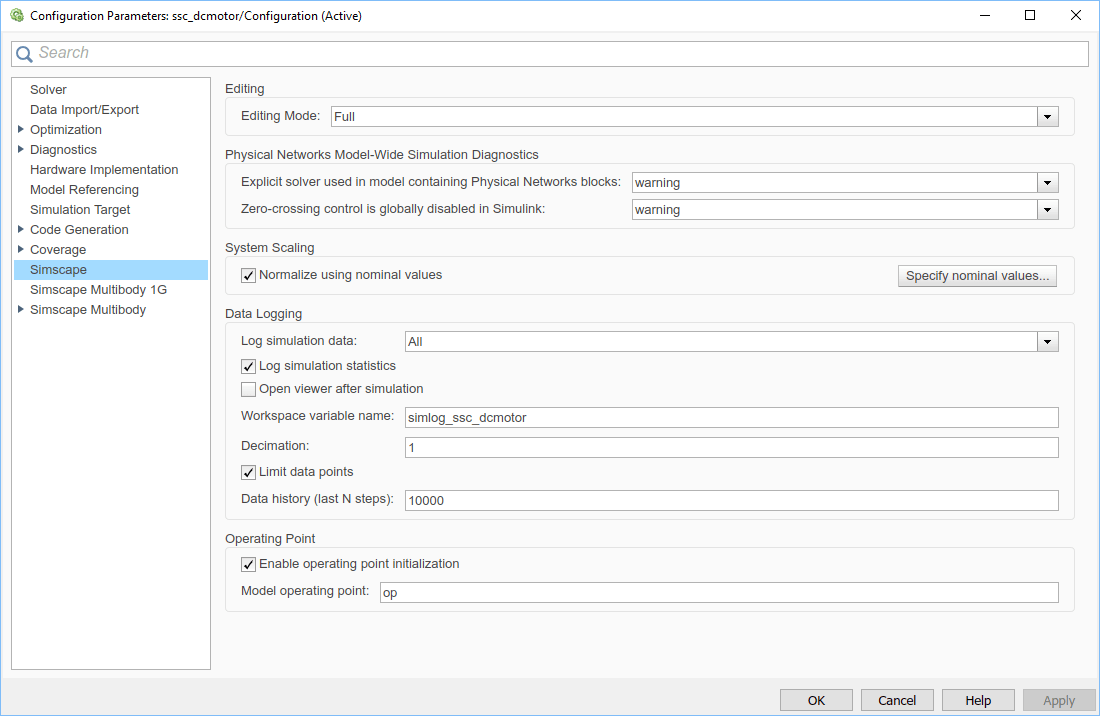 На панели Simscape установите флажок Включить инициализацию операционной точки.