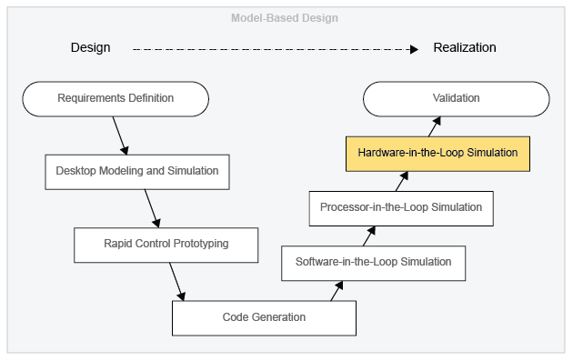 Используйте моделирование HIL для тестирования конструкции контроллера при выполнении проектирования на основе модели (MBD). На рисунке показано, где моделирование HIL вписывается в рабочий процесс проектирования-реализации MBD.