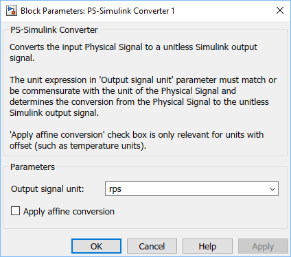 В блоке PS-Simulink Converter модуль задается с помощью параметра Output signal unit. Этот блок должен быть соизмерим с блоком входного физического сигнала, поступающего в блок. Перед выводом сигнала Simulink блок применяет коэффициент усиления, равный коэффициенту преобразования.