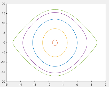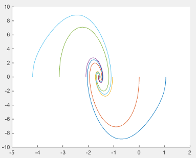 Попробуйте смоделировать модель, используя различные начальные углы. Начальный угол можно изменить в меню «Цели состояния» > «Положение» диалогового окна «Вращение блока соединения». На рисунке показан график составной фазы для начальных углов -80, -40, 0, 40 и 80 градусов.