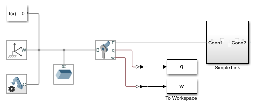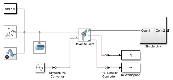 Подключите блоки, как показано на рисунке. Убедитесь, что блок «В рабочую область» имеет имя переменной q подключается через блок PS-Simulink Converter к порту q блока вращательного соединения и что блок To Workspace с именем переменной w подключается к порту блока поворотного соединения w.