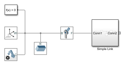 Подключите блоки, как показано на рисунке. Ориентация порта блока Поворотное соединение (Revolute Joint) становится важной, когда задаются цели состояния соединения, предписываются вводы срабатывания соединения или считываются динамические переменные соединения. Блок поворотного соединения интерпретирует каждую величину как величину, применяемую к ведомой раме относительно базовой рамы, поэтому переключение соединений портов может повлиять на сборку модели и моделирование.