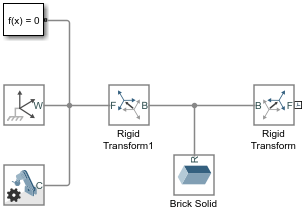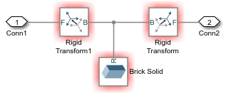 Переверните блок жесткого Transform1, чтобы можно было соединить B-порты двух блоков жесткого преобразования друг с другом и блок твердого кирпича.