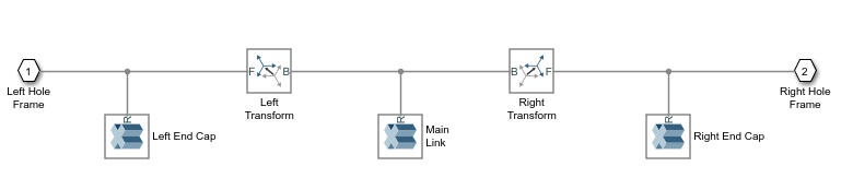 На рисунке показана основная блок-схема для подсистемы тела двоичной линии связи. Эта диаграмма включает в себя три сплошных блока, представляющих центральную и дистальную части двоичного звена. Два блока Rigid Transform перемещают дистальные тела в соответствующие места вблизи концов центрального тела.
