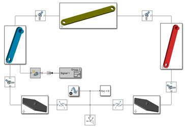 Рассмотрим пример четырехпланки Simscape Multibody. Эту модель можно открыть в командной строке MATLAB ®, введяsm_four_bar. Модель состоит из подсистем твердого тела, соединенных между собой соединительными блоками. Блоки соединения определяют степени свободы, доступные между телами. Подсистемы тела определяют через базовую блок-схему свойства тела.